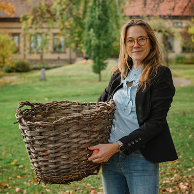 Arkivbild på Maria Nagle bland äpplen som är färdiga att plockas. Foto: Privat
