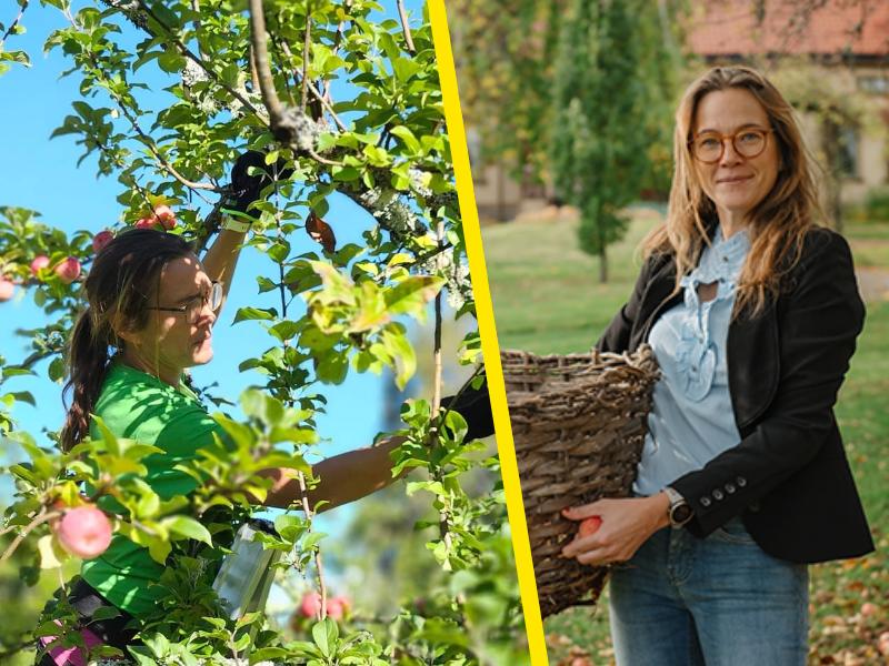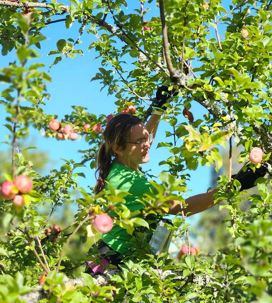 Arkivbild på Maria Nagle bland äpplen som är färdiga att plockas. Foto: Privat