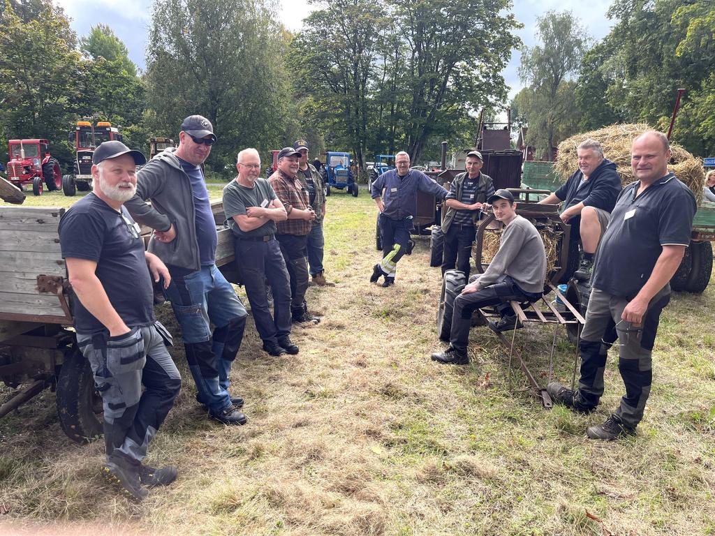 Ett tiotal gubbar brukar hjälpa till med aktiviteterna på åkern under Tångeråsadagen. Reaktionerna från besökarna på Kjells fordon och maskiner är positiva.