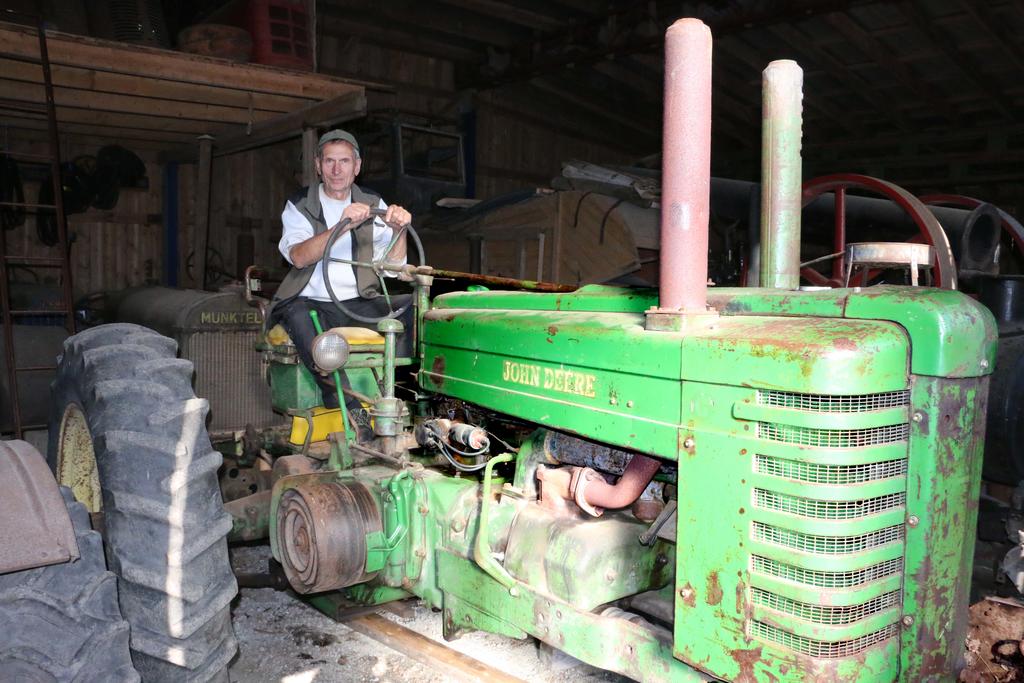 Kjell Karlsson bakom ratten på en veteran John Deere. Han äger ett trettiotal veterantraktorer. Foto: Peter Eriksson