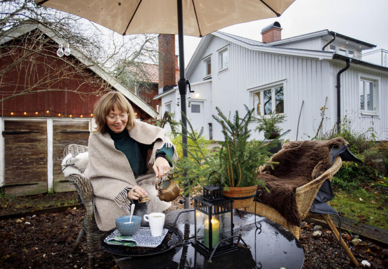Varje morgon under 2025 har Kristina yogat och sedan utfört sin morgonritual med kaffe och gröt. Är det kyligt ute pälsar hon på sig. Sedan väljer hon en plats i trädgården och i tystnad intar hon sin frukost.