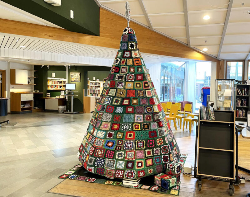 850 julinspirerade mormorsrutor lämnades in när kommunens kulturavdelning på nytt lyfte fram hantverkstekniken, virkning. Den här gången sattes rutorna ihop till en julklapp, modell större. På lördag 20 december lyfter tomten på locket.