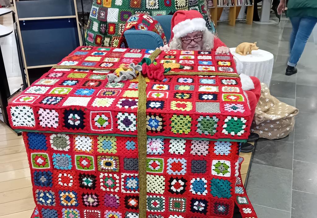 850 julinspirerade mormorsrutor lämnades in när kommunens kulturavdelning på nytt lyfte fram hantverkstekniken, virkning. Den här gången sattes rutorna ihop till en julklapp, modell större. På lördag 20 december lyfter tomten på locket.