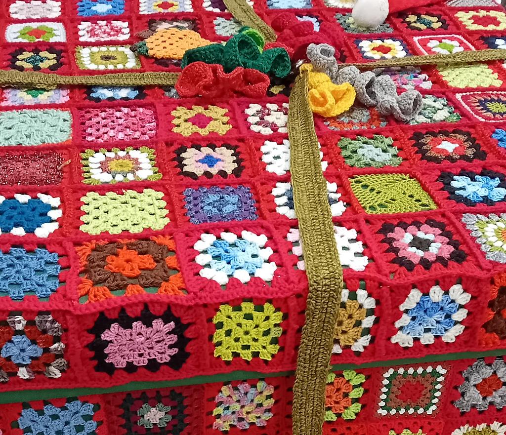 Fantastiskt vacker och färgsprakande julklapp bestående av 550 virkade mormorsrutor visas nu på Kumla bibliotek. På lördag öppnar tomten paketet och delar ut det som döljer sig däri. Foto: Björn Palmqvist