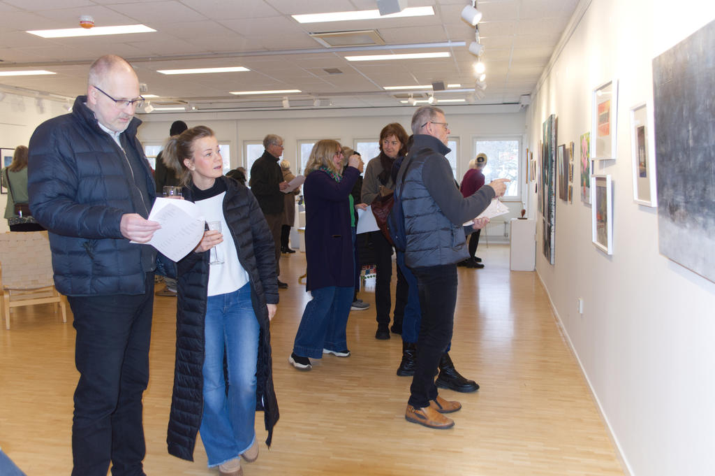 Ett åttiotal besökare trängdes bland konstverken när det var vernissage. På väggarna hängde måleri och på golvet stod objekt i textil och det fanns glas, keramik och ett metallhjärta att betrakta. En av utställarna var Moa Kvarnström från Timansberg.